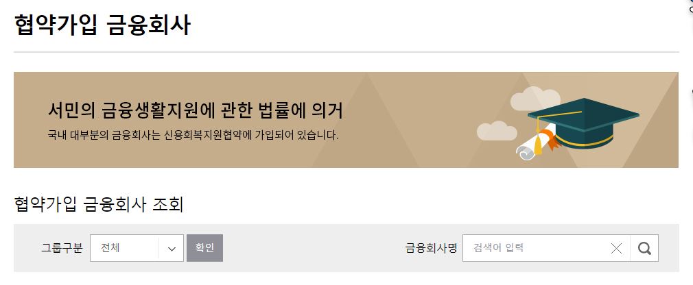 신용회복위원회는 『서민의 금융생활 지원에 관한 법률』에 근거하여 신용회복 지원 협약을 체결한 금융회사 채무를 조정하는 사적 제도입니다. 국내 대부분 금융회사들이 신용회복지원 협약에 가입되어 있기는 하지만 아래 링크에서 본인이 대출받은 은행에 대해서 협약 금융회사인지 확인을 하여야 합니다.