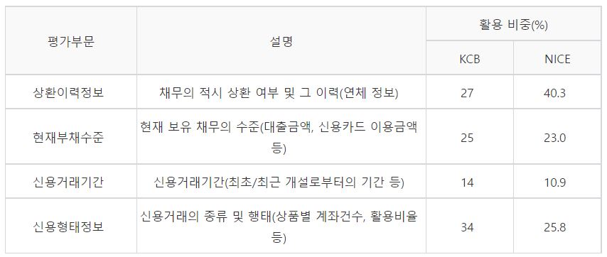 KCB에서 가장 많이 보는 것이 신용형태 정보인 신용거래의 종류 및 형태를 많이 보고 NICE에서는 상환 이력정보인 채무의 적시 상환 여부 및 그 이력 (연체정보)를 많이 봅니다. 그래서 평점이 달라지는 것입니다.