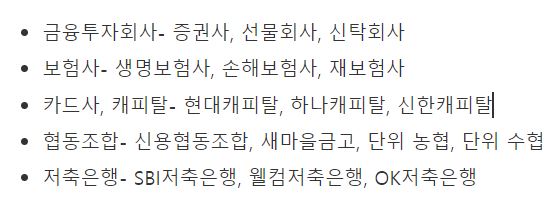 금융기간의 종류는 금융투자회사, 보험사, 카드사, 캐피털, 협동조합, 저축은행으로 나뉩니다.